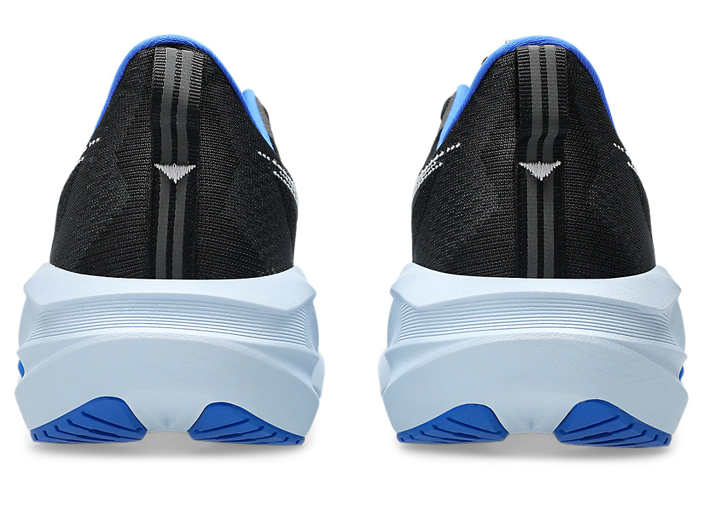 ASICS Novablast 5 có trọng lượng nhẹ chỉ khoảng 255g (nam) và 225g (nữ), độ dốc 8mm với chiều cao đế 41.5mm gót và 33.5mm trước bàn chân, mang lại sự cân bằng giữa đệm dày và cảm giác gần mặt đất. Thiết kế true to size với khoang mũi rộng hơn, phù hợp cho người chạy bằng gót hoặc giữa bàn chân, cùng màu đen cổ điển tạo vẻ ngoài tinh tế và dễ phối đồ.